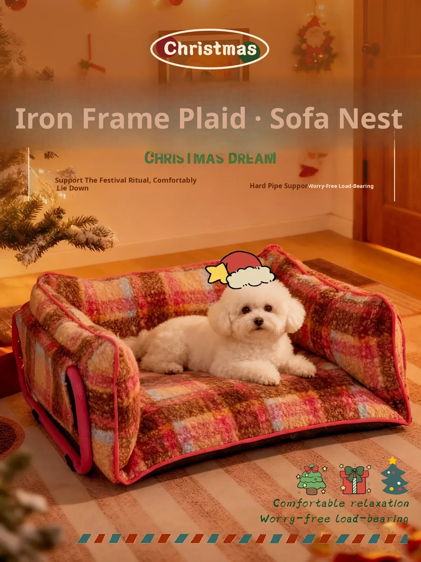 Cozy Christmas Plush Pet Bed - Removable Washable Sofa Bed with Iron Frame, Checkered Design for Small Dogs and Cats, Warm and Comfortable Pet Nest