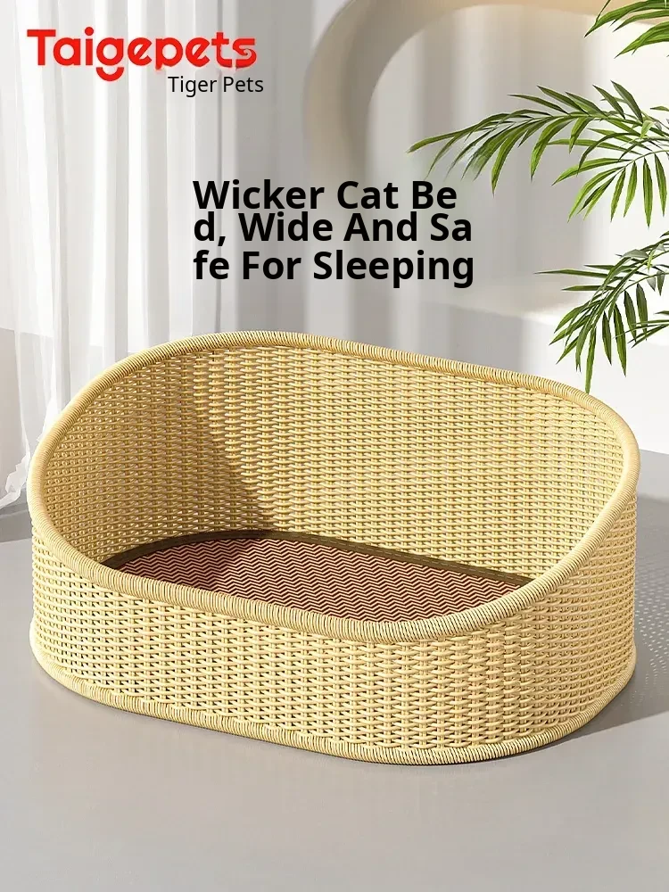Handwoven Rattan Cat Bed - All-Season Cozy Sleeping Mat for Cats, Integrated Washable Scratching Board, Perfect for Autumn & Winter Warmth, Essential Cat Supplies