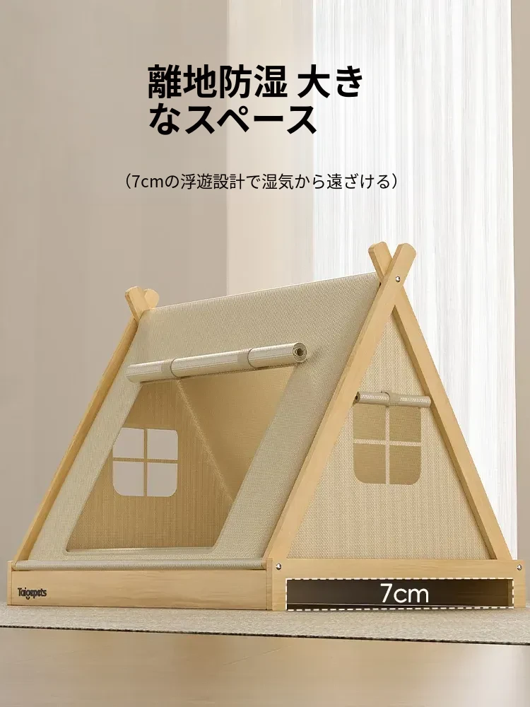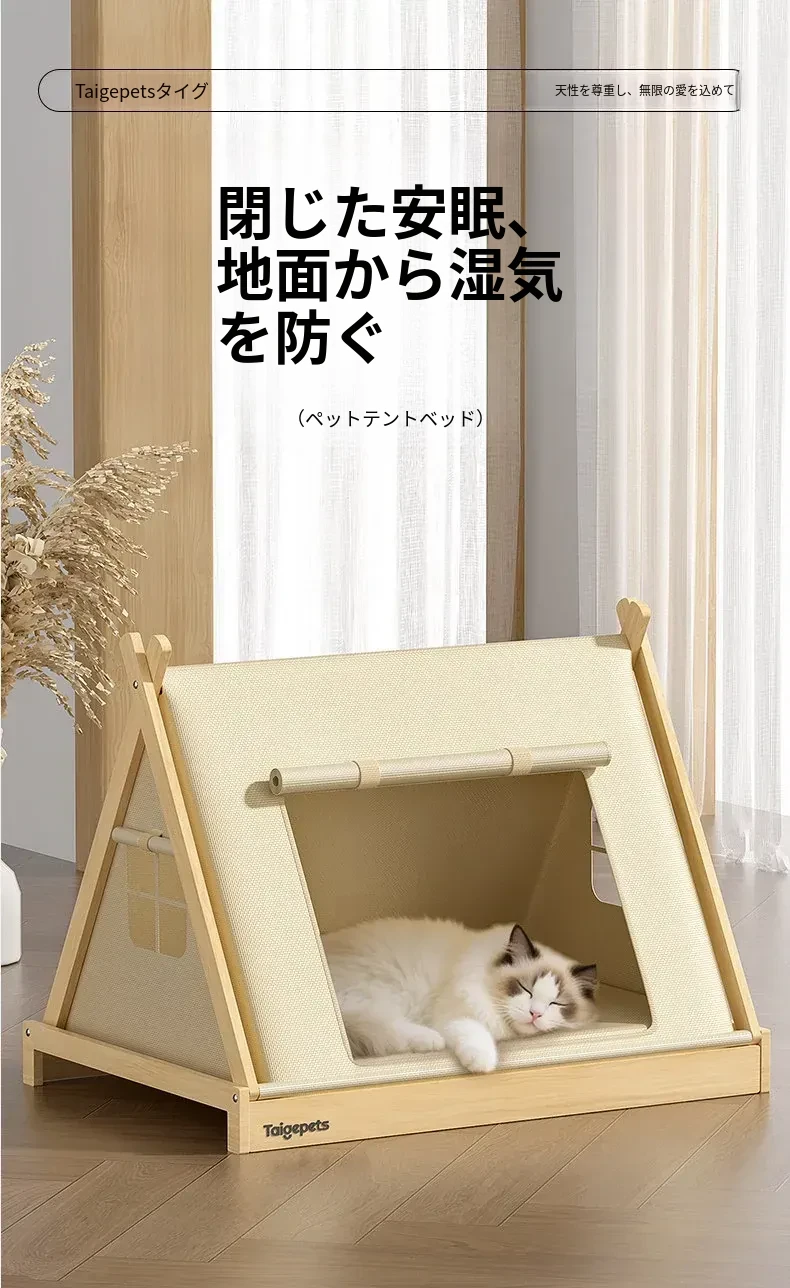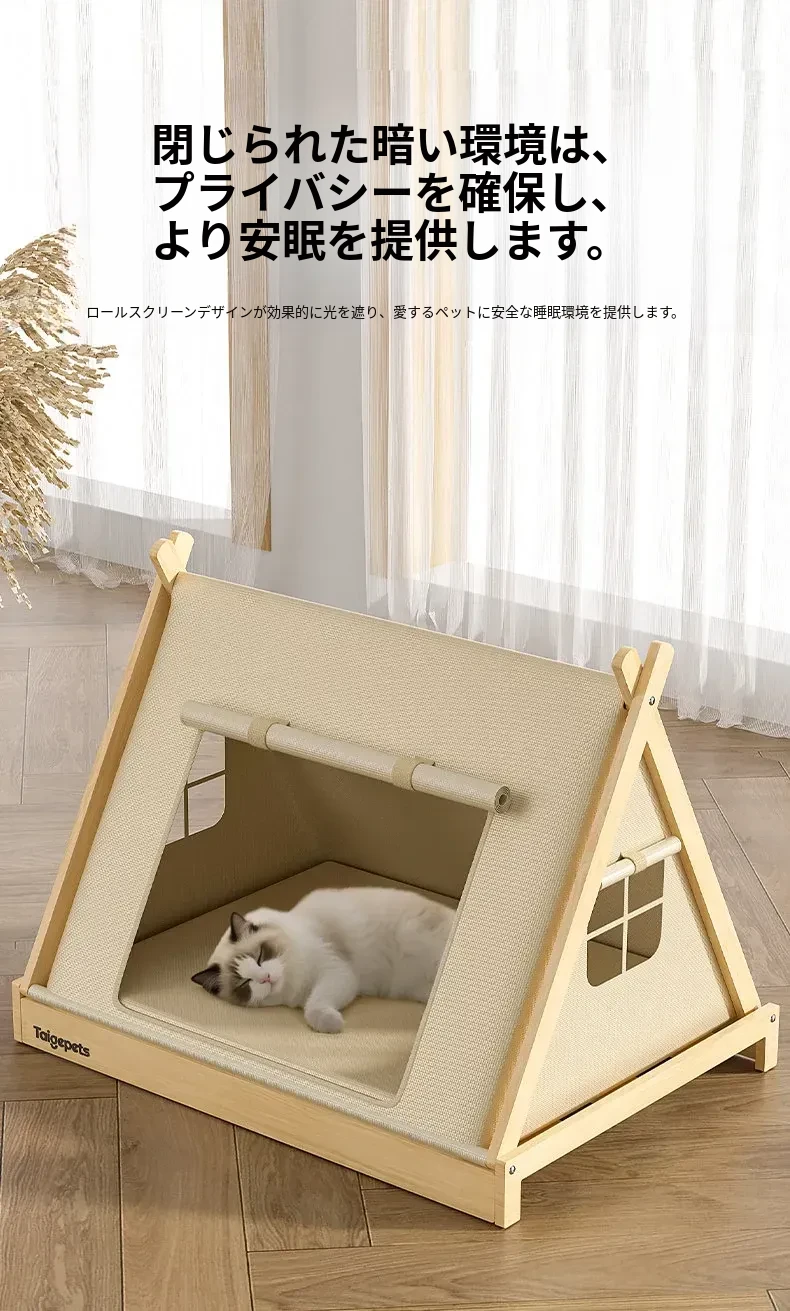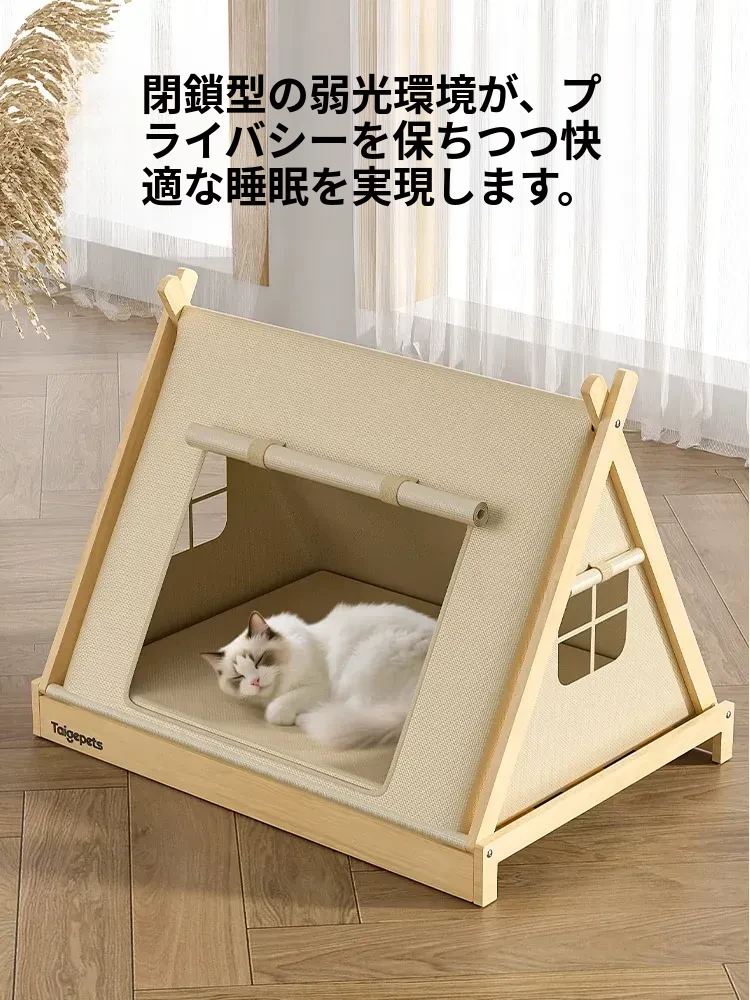 天然木製キャットテント!四季使えるキャットベッド、ペットソファ。夏にぴったりの半封閉型で、安心感を提供する猫のハウス!愛猫のための快適空間をお届けします。