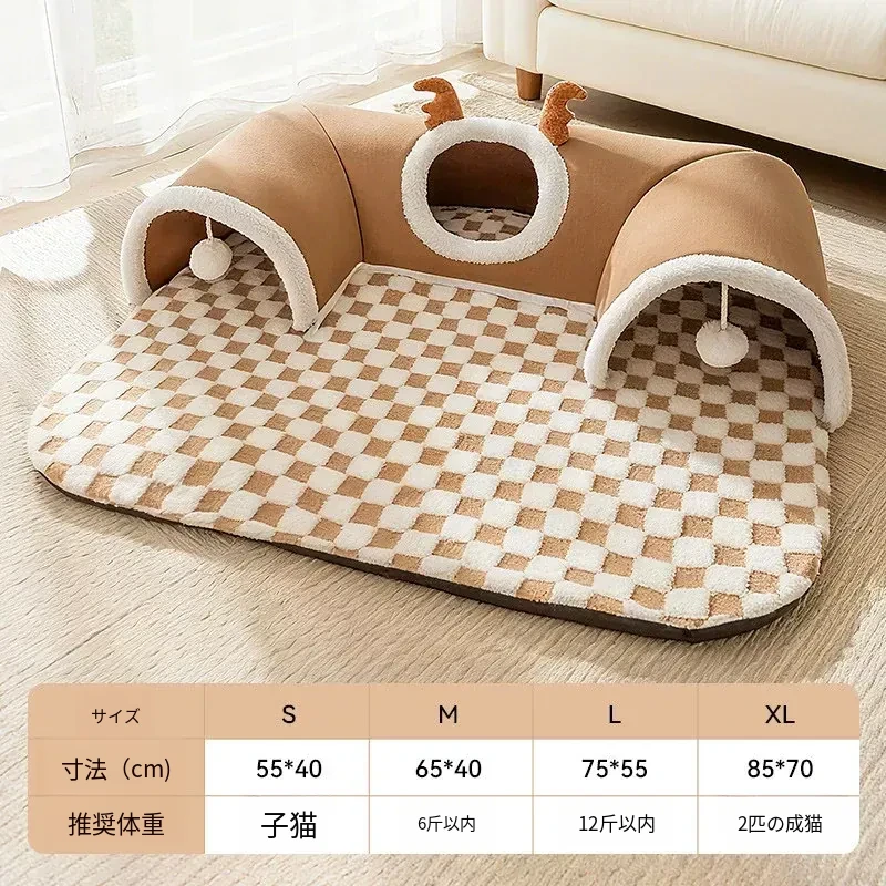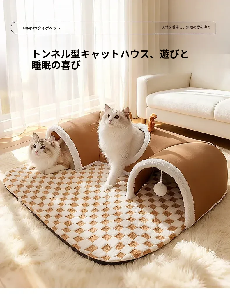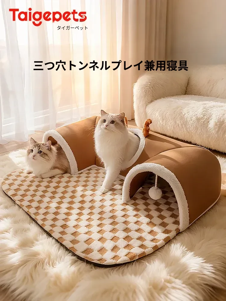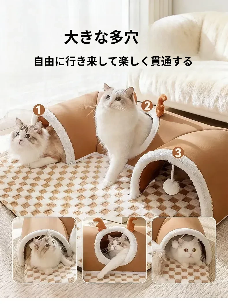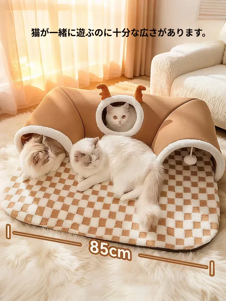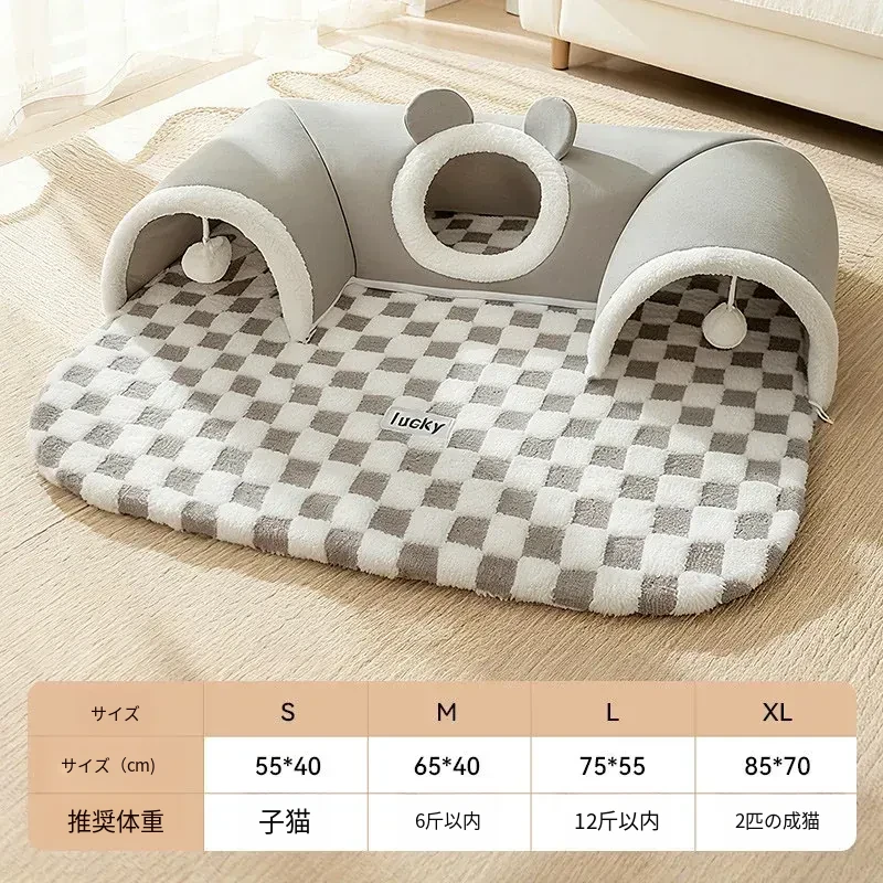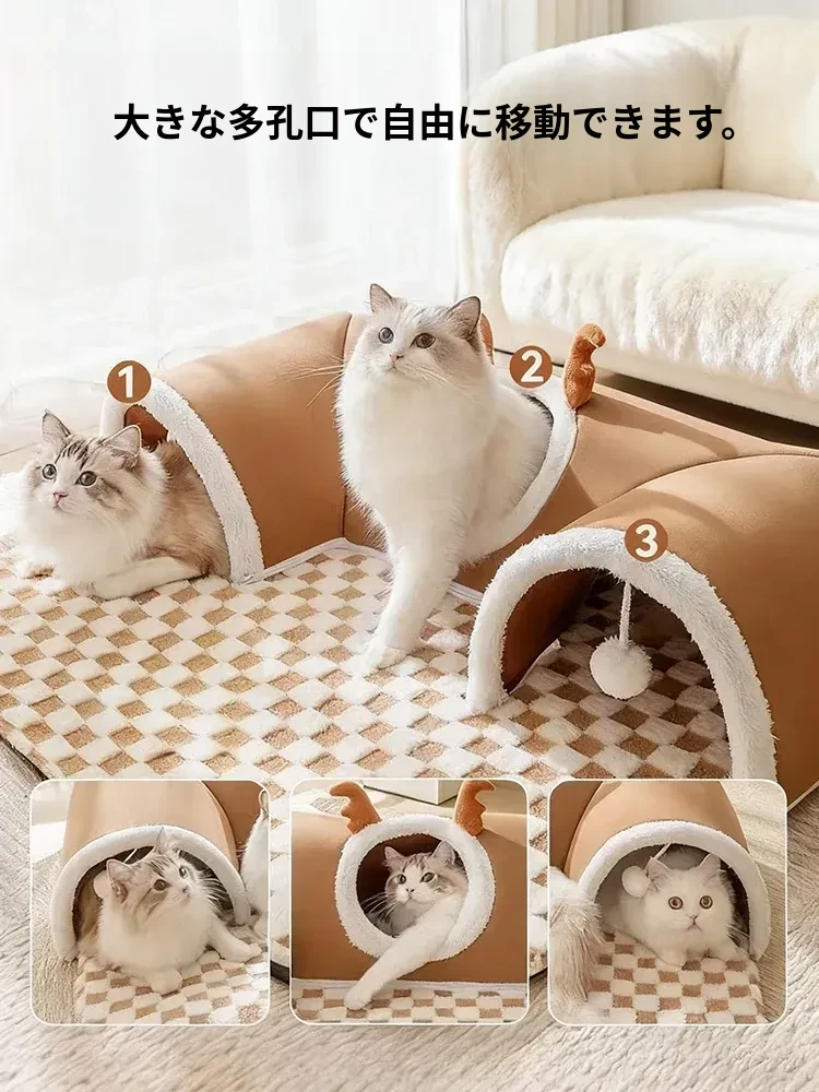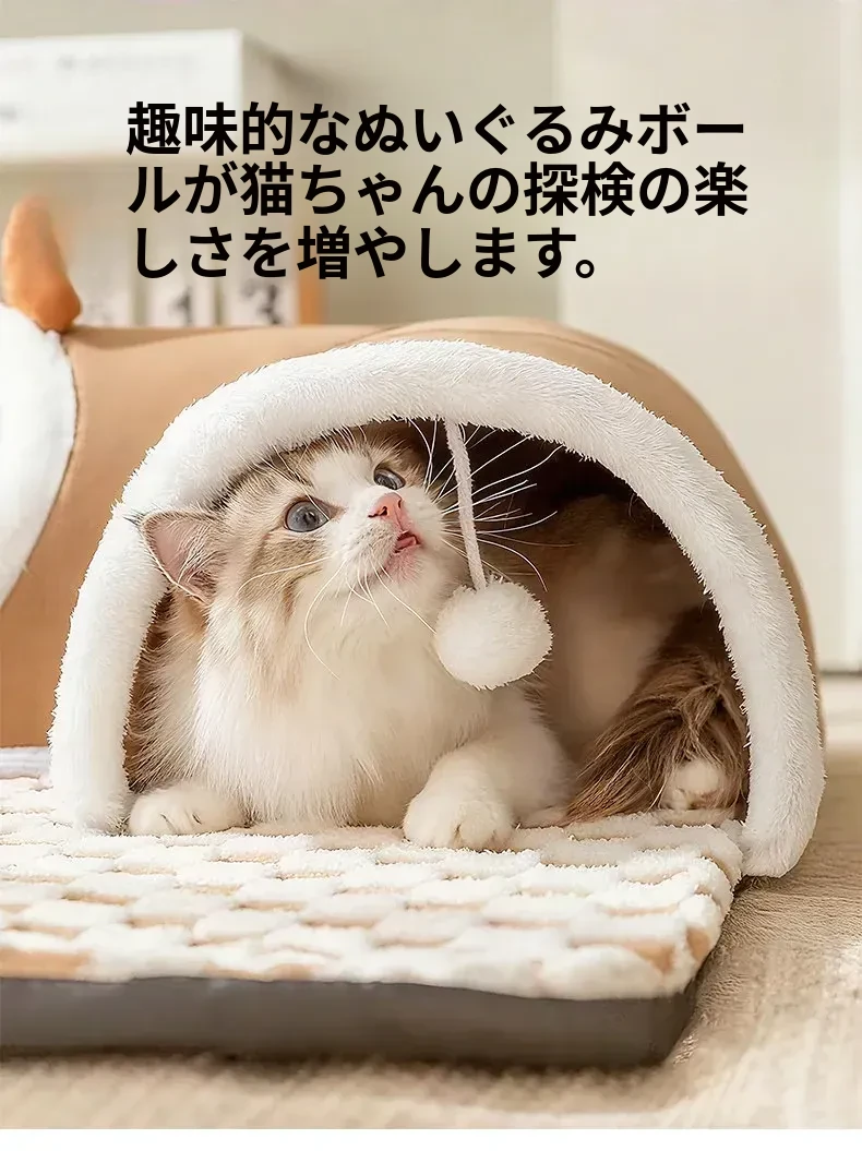 キャットトンネル&ベッド - 四季に対応、超大容量で安心感抜群!子猫も安心して隠れられるドア穴付きの封閉式デザイン。あなたの猫ちゃんに快適な睡眠空間を提供します!