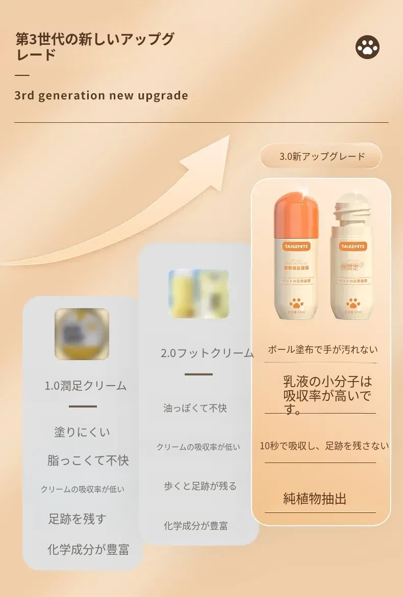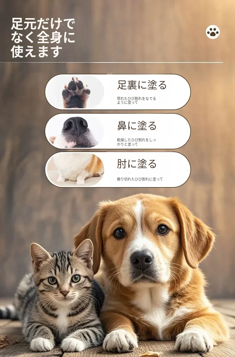 ペット用爪保護クリーム!犬猫の足裏をしっかり潤し、乾燥や亀裂から守ります。愛するペットの大切な足を、しっとり柔らかくケアする最高のアイテムです!