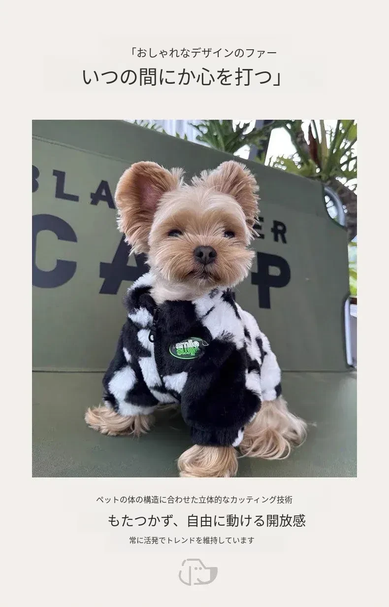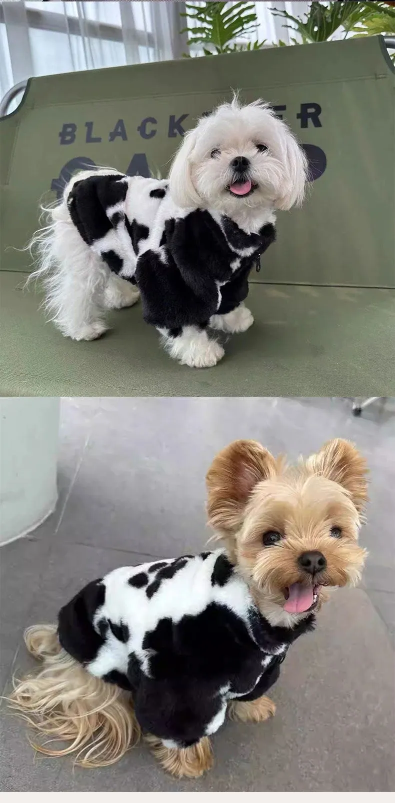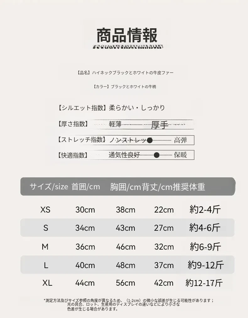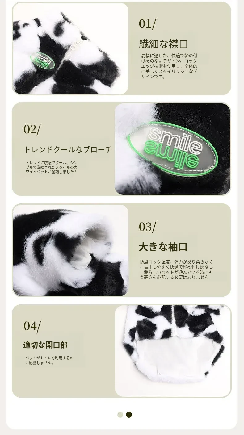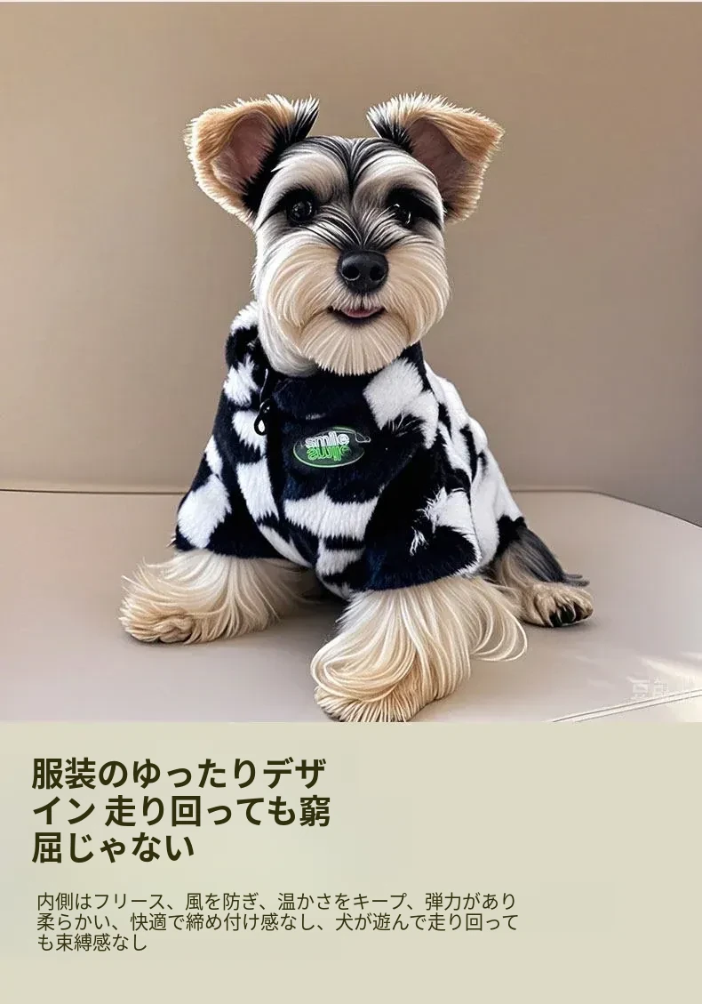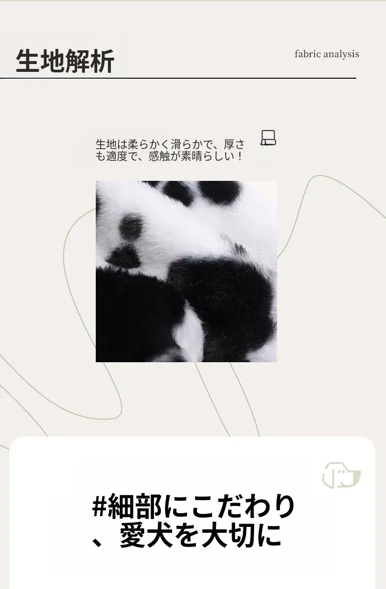 冬の必需品!ふわふわの保温性抜群、シュナウザー・コーギー・テディ・ビションフリーゼ向け、かわいいミルク牛風ファーコート【小型犬・猫用】