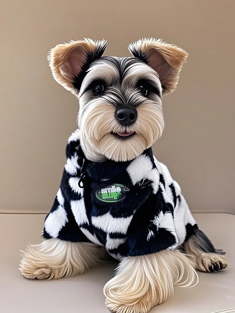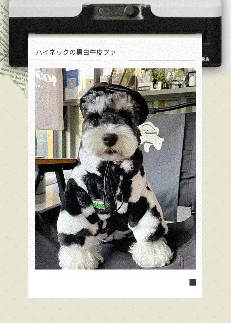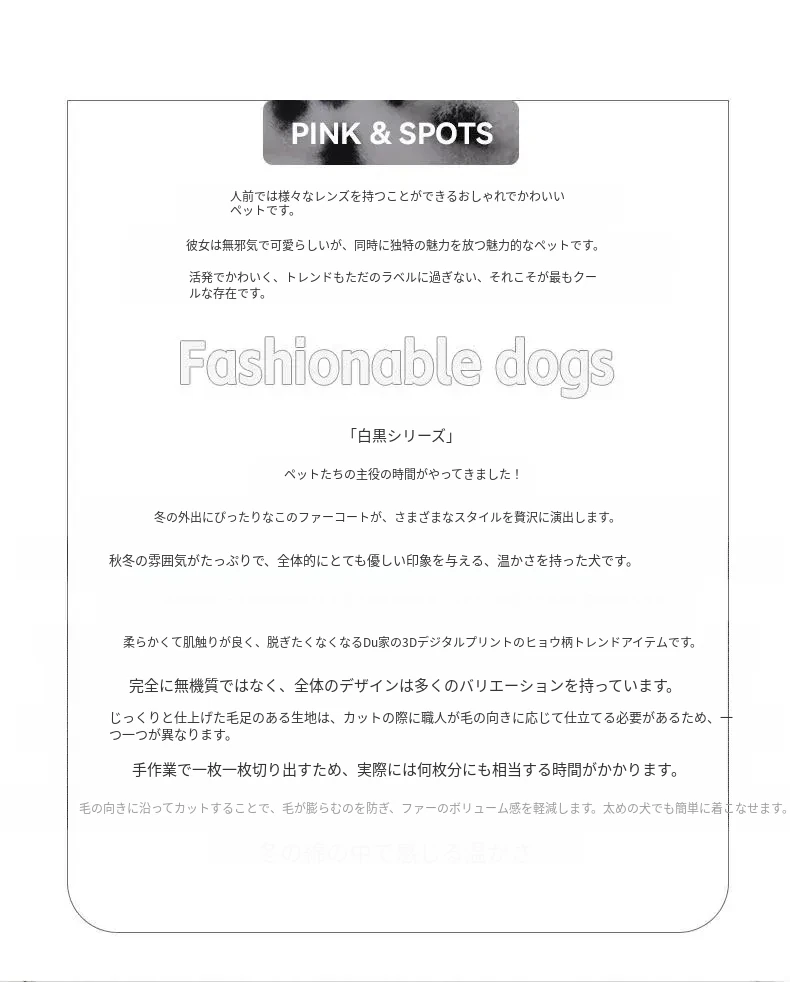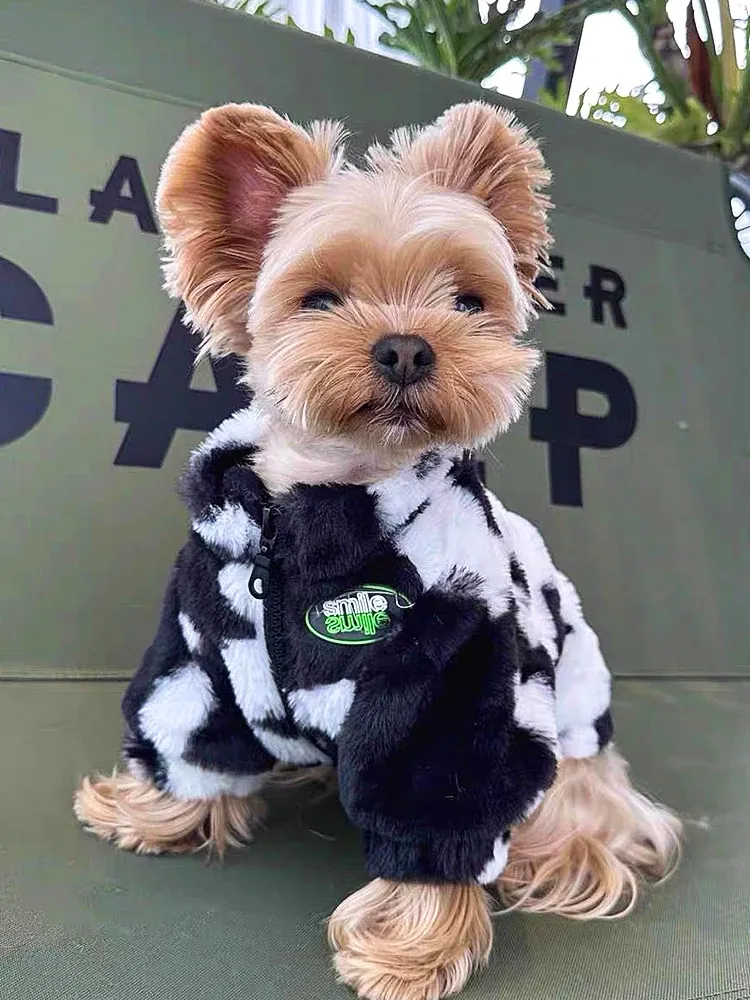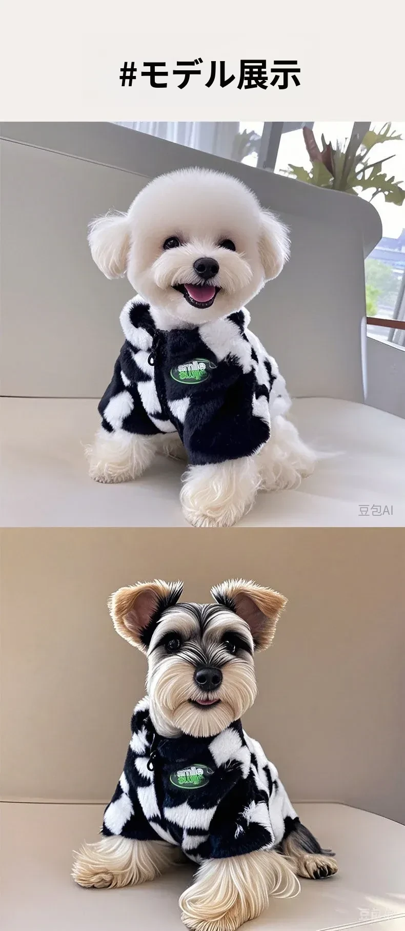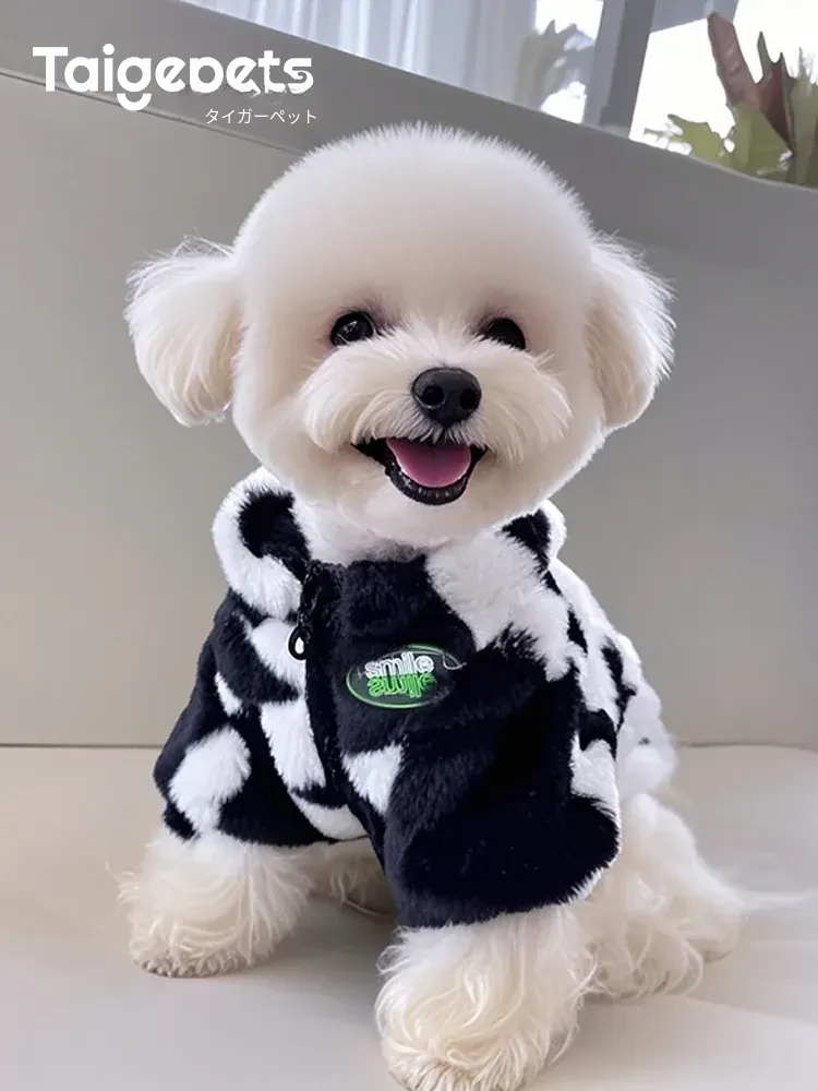 冬の必需品!ふわふわの保温性抜群、シュナウザー・コーギー・テディ・ビションフリーゼ向け、かわいいミルク牛風ファーコート【小型犬・猫用】